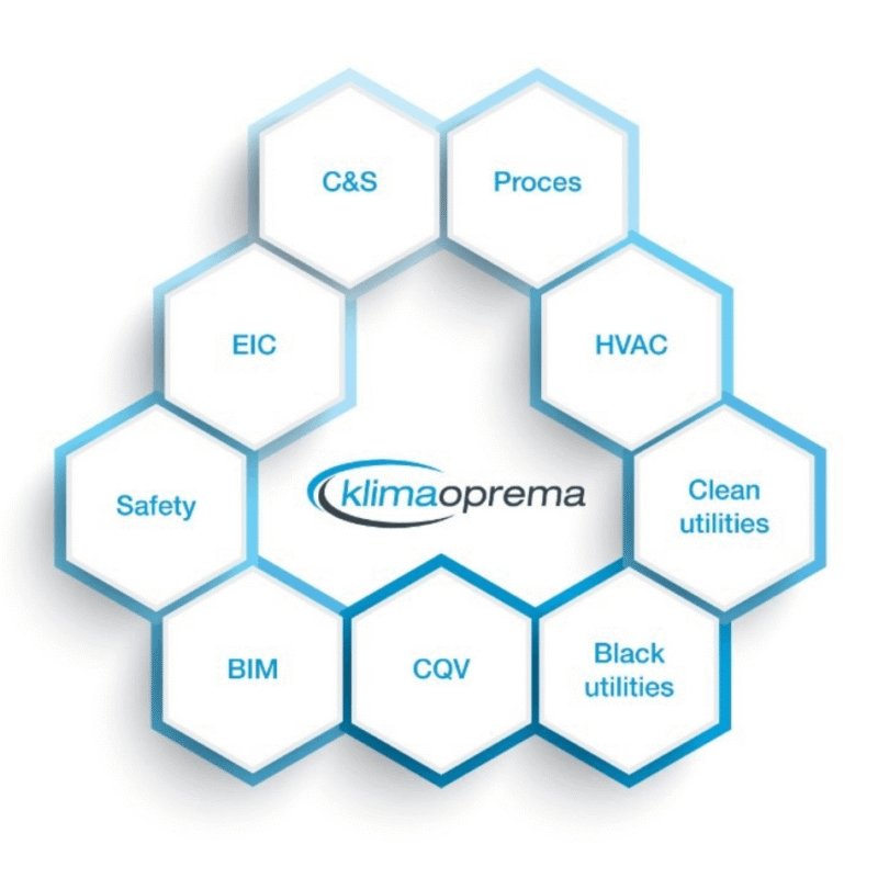 Klimaoprema’s preferred method for planning a new facility is based on a Building Information Modeling (BIM) approach. BIM is our shared infrastructure for working, sharing, and innovating across our Engineering projects. Our 3D database systems support our delivery in a simple and agile way. We implement one shared toolset that gives us the ability to share work with all our offices around the globe. All relevant building data are digitally recorded, compiled, and shared with all our offices, as well as with our partners. A geometrical representation of a building is shown through a virtual federated model, and the information and space data are retained in a live database.