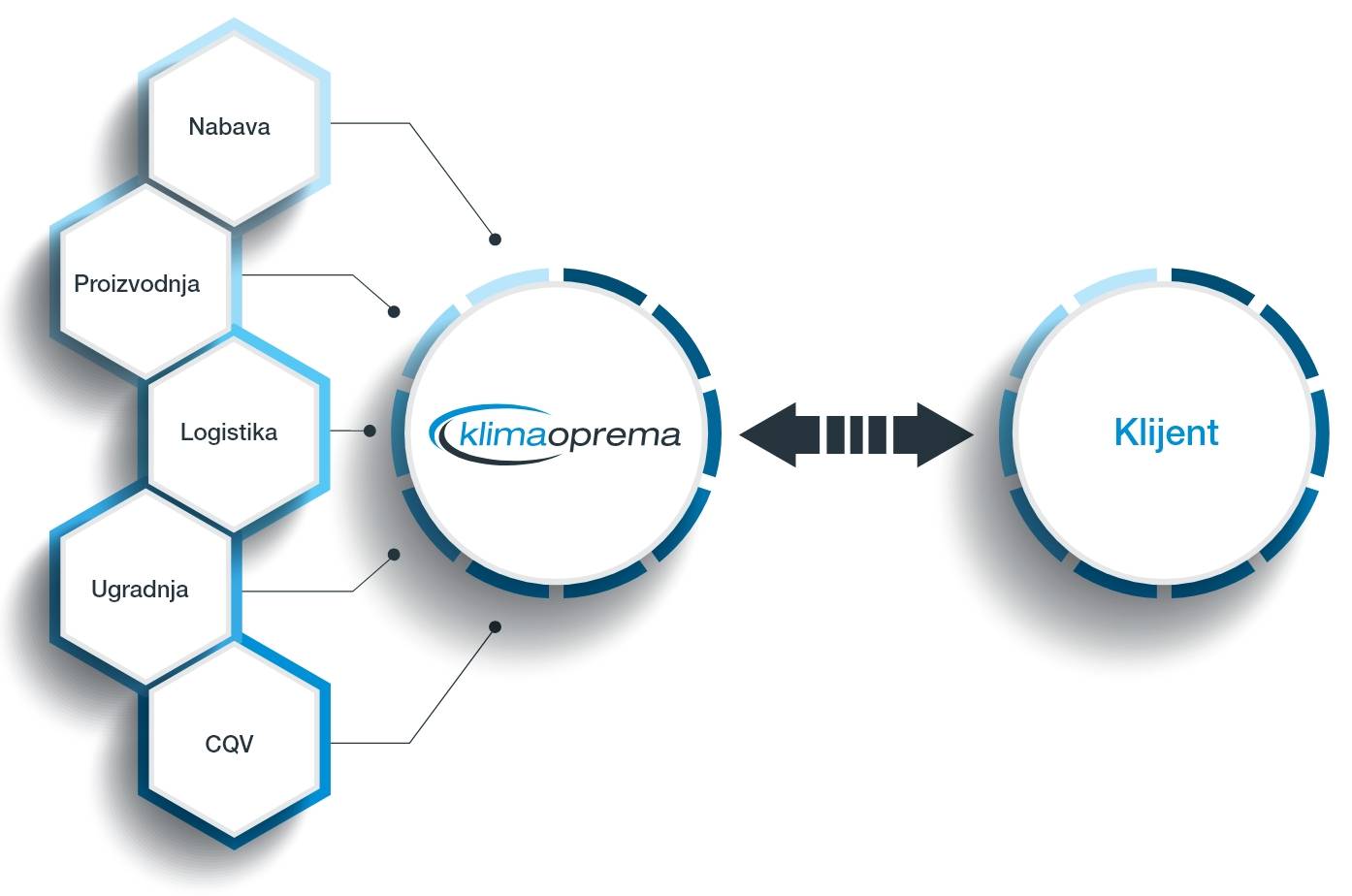 Temelji se na smjernicama društva Klimaoprema za model izvršavanja projekata i na vanjskim standardima, a uključuje sve elemente životnog ciklusa projekta od front-enda (konceptualni dizajn), inženjeringa (osnovni i detaljni dizajn) do izgradnje, puštanja u pogon i kvalifikacije, kao i primopredaje.